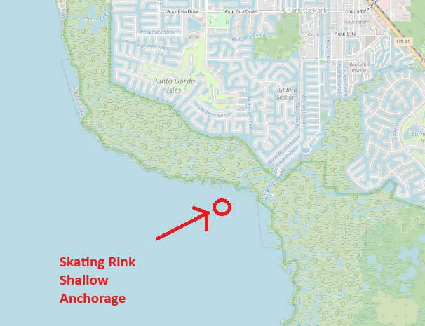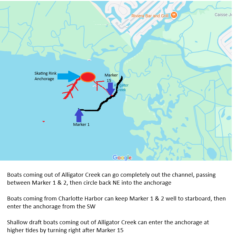 The location is the "Skating Rink" anchorage, just north of the Alligator Creek entrance channel. To get there, go out Alligator Creek entrance and then turn right. Or from Ponce or Fishermans Village, you can south towards the Alligator Creek entrance channel, and go into the anchorage from the NW.